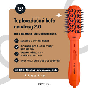 Snívaš o hladkých, lesklých a objemných vlasoch bez zdĺhavého fénovania a stylingu? Freylish® Teplovzdušná kefa 2.0 kombinuje sušič vlasov a stylingovú kefu v jednom zariadení, čím ti umožní dosiahnuť dokonalý účes za polovičný čas. Vďaka pokročilej turmalínovej a iónovej technológii bude tvoja koruna krásy chránená, hladká a bez krepovatenia.